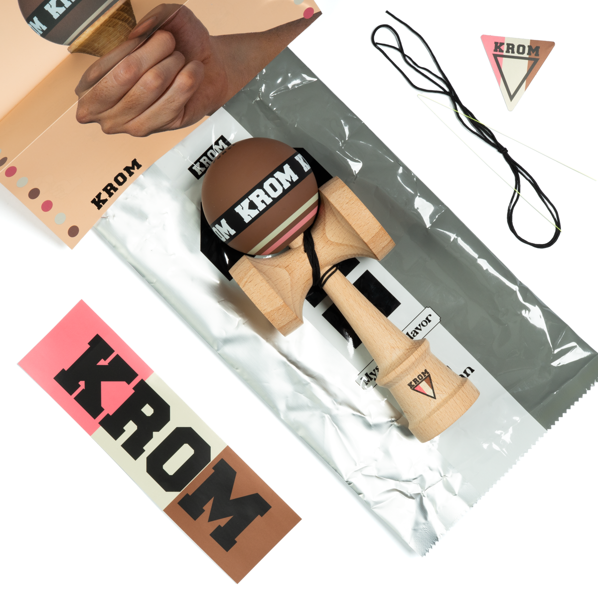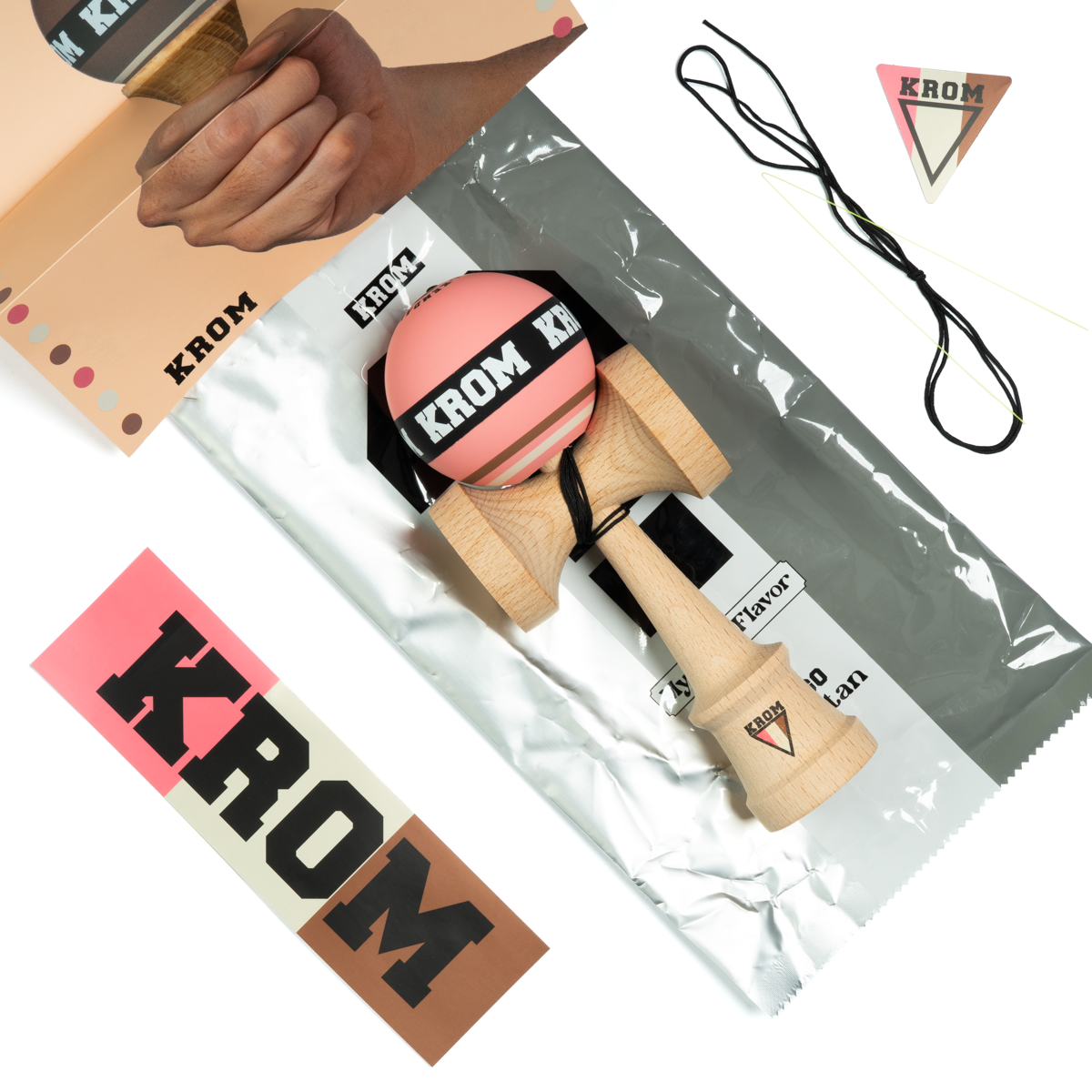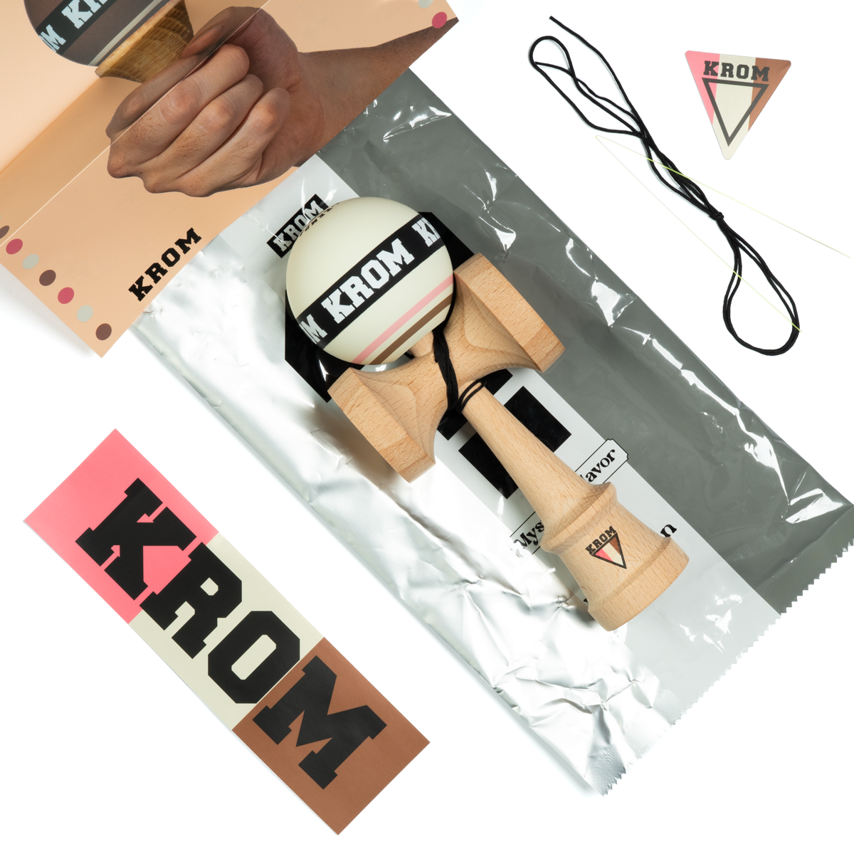 The package includes a KROM kendama, stickers, mini bearing, extra string and a string tool.